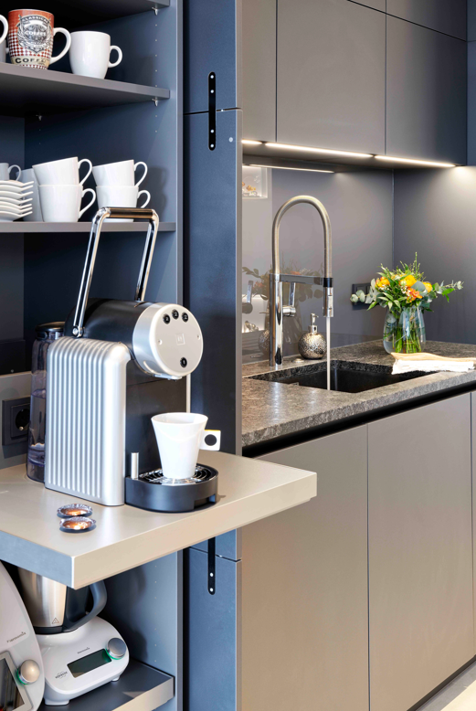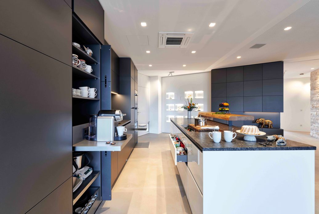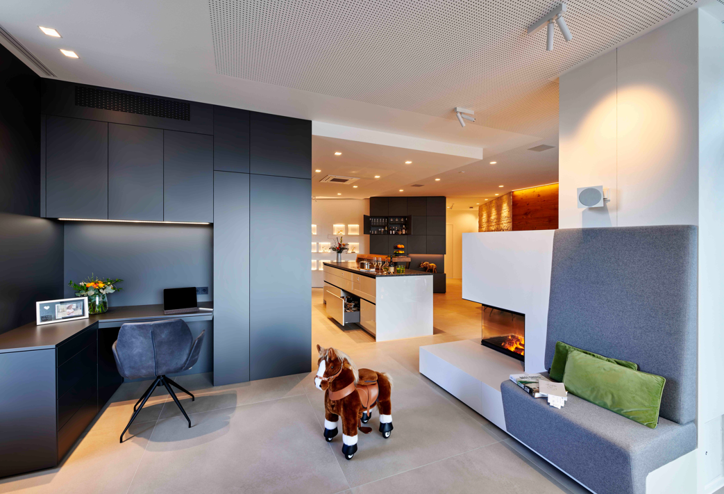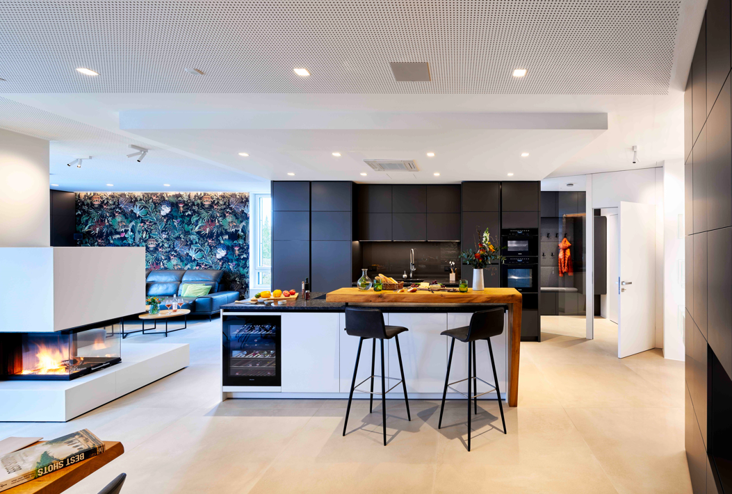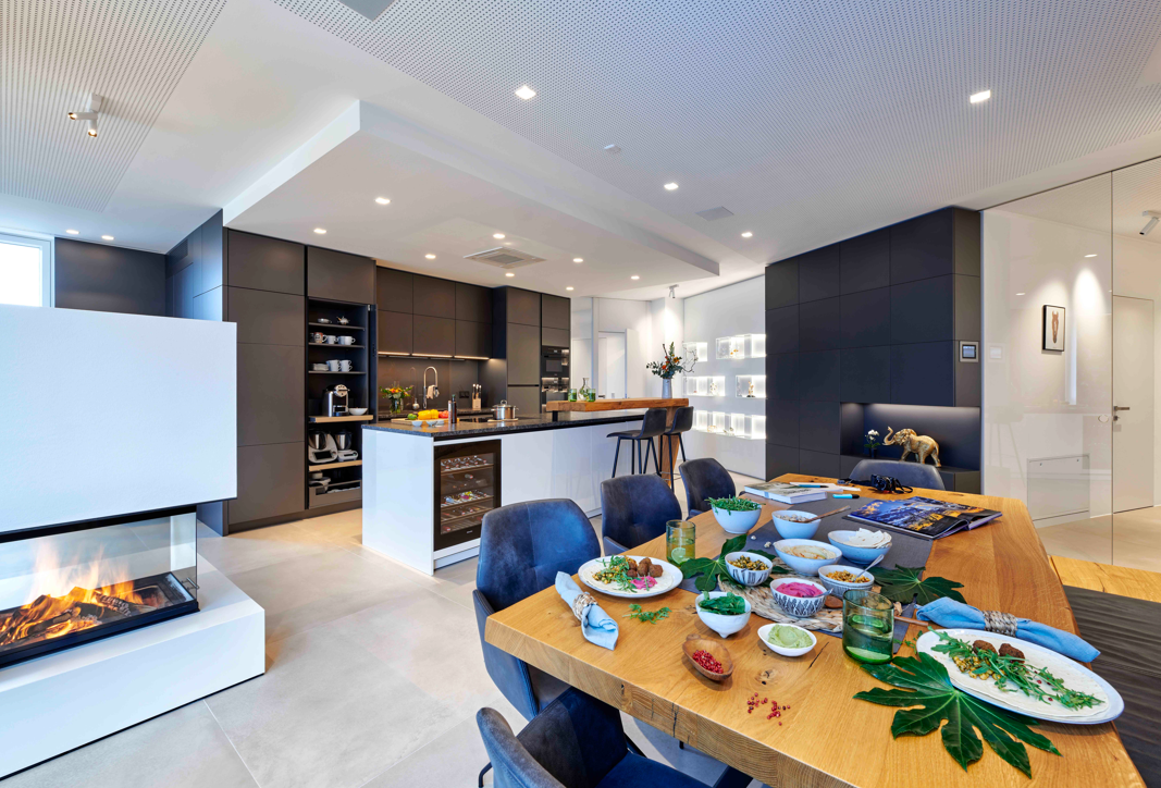 – Bei diesem offenen Konzept sind Wohn, Ess- und Kochbereich rund um den Kamin angeordnet. Bestehend aus einem carbonfarbenen Schrankensemble und davor einer Kochinsel mit glänzend weißen Fronten. Passend dazu wurden auch die Garderobe, eine Hausbar und Weiteres angefretigt. Der ideale Platz, an dem Familie und Freunde zusammenkommen!